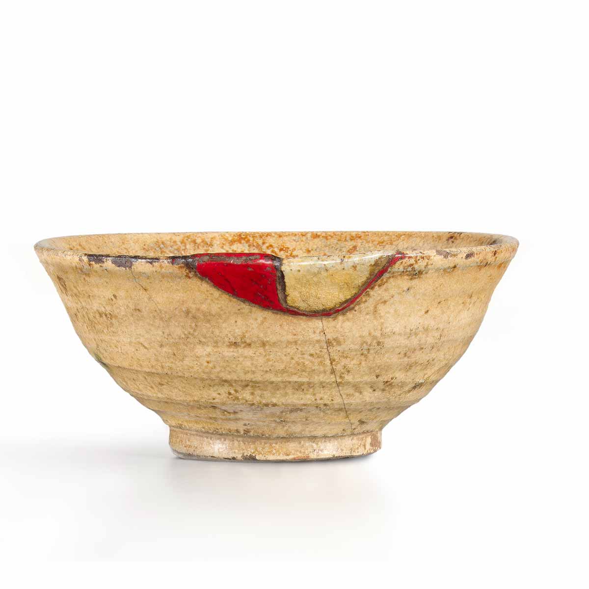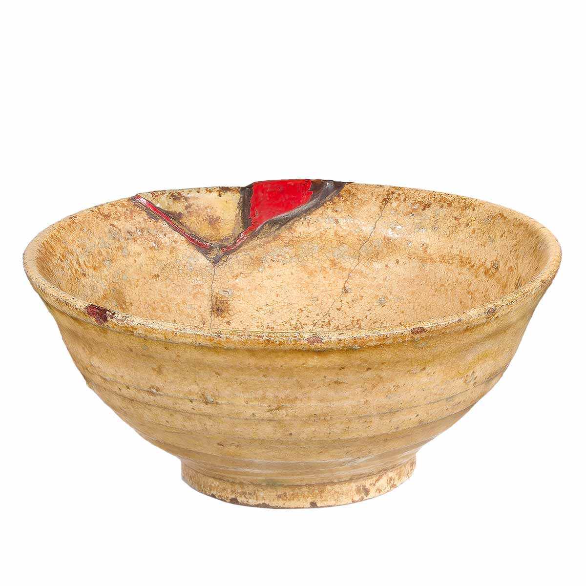 Bol à thé en grès de Seto Jaune et restauration yobitsugi à la laque rouge