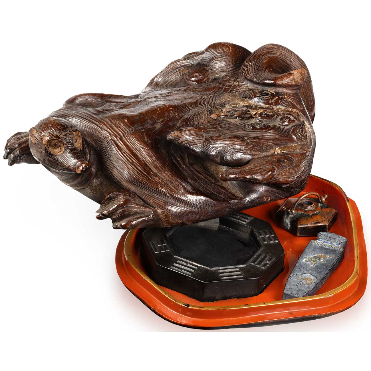 D'anciens symboles de pouvoir sont dispersés sur la surface d'un bois brut naturel. Les motifs comprennent des perles magatama en nacre et en plomb, un miroir en argent avec des motifs calligraphiques dorés, une tête de lance gravée, la tête dorée d'un bâton, etc. La boîte de collection est intitulée Kōrin maki-e mokusei kashibon (plateau à sucreries en bois décoré de motifs en laque dans le style de Kōrin). Une œuvre d'art spectaculaire combinant la magnifique technique d'Ogata Kōrin (1658-1716) et l'appréciation du wabi-sabi dans la surface en bois dégradée.