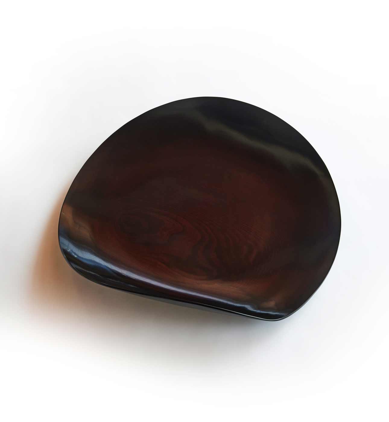 Il sculpte ses formes dans du bois de keyaki (Zelkova serrata) qu'il recouvre de dizaines de couches de laque urushi polie.