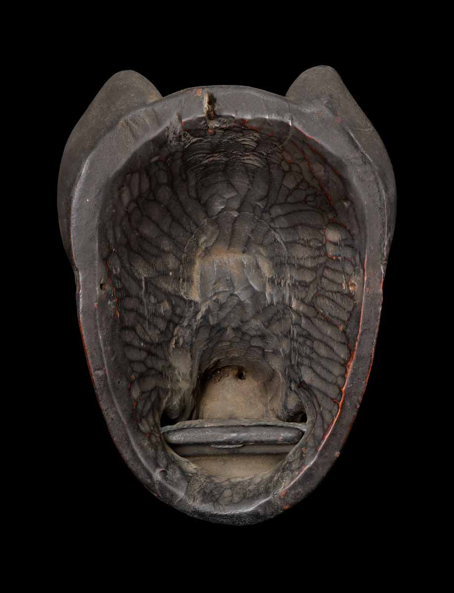 Ce masque figure un kitsune, le renard du folklore japonais, doté du pouvoir de se métamorphoser en humain. Le renard occupe de nombreux rôles dans les croyances populaires : symbole de fortune et d’abondance, il protège les sanctuaires shintō en tant qu’Inari-san, mais il incarne aussi la ruse et la duplicité, capable de prendre l’apparence d’une femme pour tromper et attirer ses victimes vers leur perte.