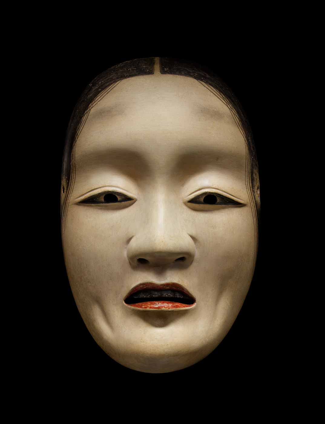 " Bien que le masque appartienne à une catégorie typique de masques nō Waraijo, il s'agit d'un rarissime exemple en cuir. Le matériau et le processus de fabrication suivent le même processus que celui utilisé pour la fabrication des mempo, l’armure faciale des samurai.