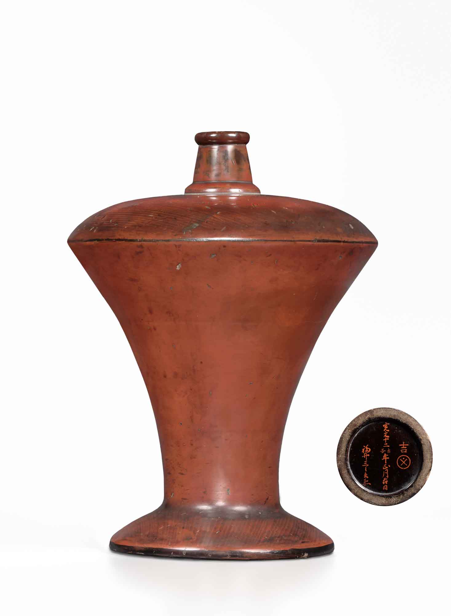 “Symphony of Red and Black, Beauty of Negoro. Number 91. Negoro heishi, one item, maximum height 32.4 cm, Muromachi Period (15-16th century), inscribed with “Kanbun 12th year” which indicates that it was the year when the object was later restored, a private collection]