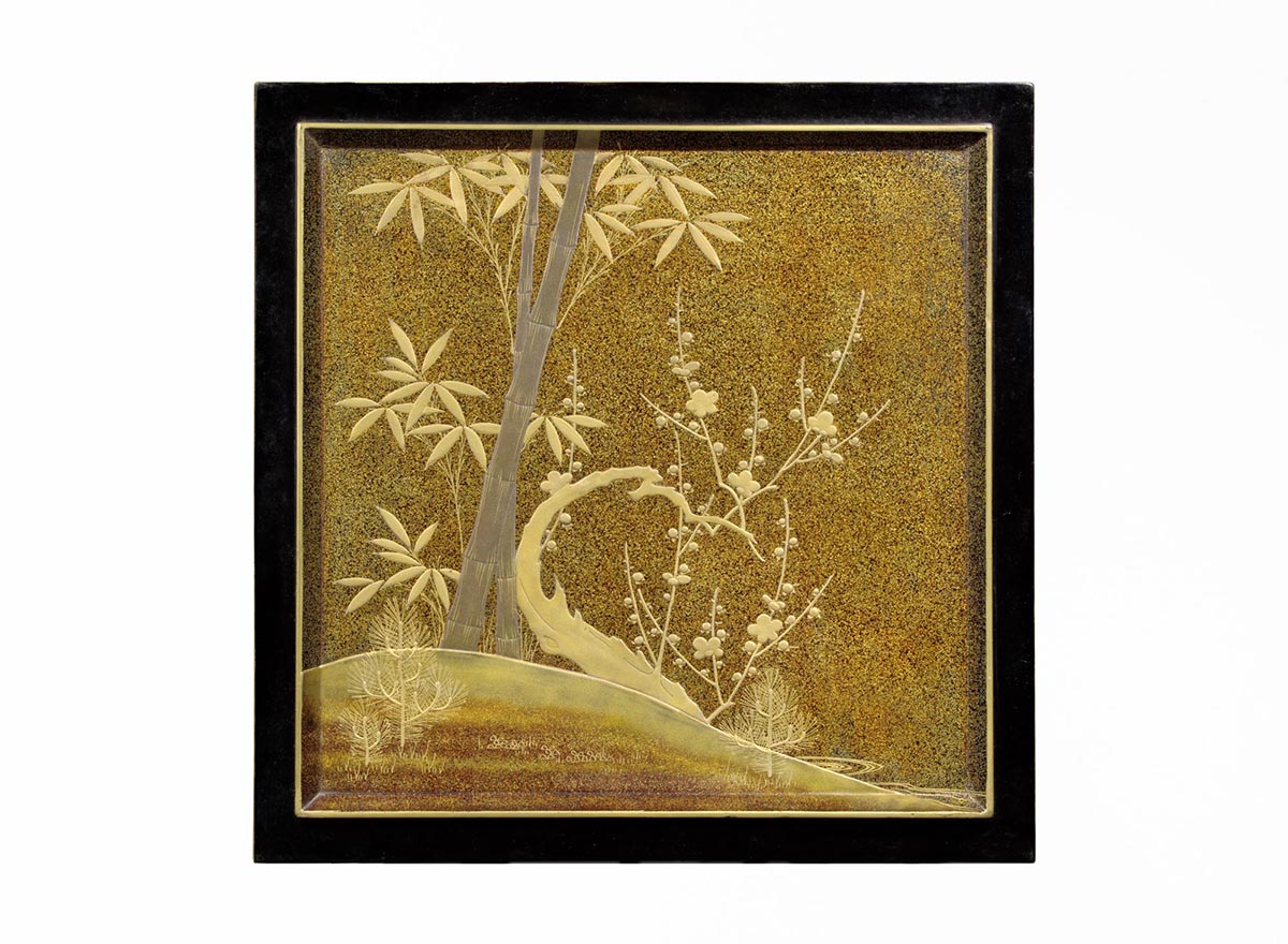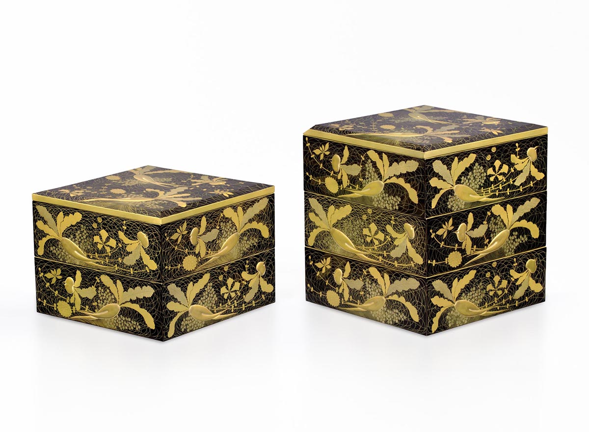 Ces objets ont été réalisés avec une technique extrêmement fine de maki-e sur l’intérieur et l’extérieur. Ce Jyūbako a deux couvercles et peut être arrangés en 3 + 2 boîtes. Le côté interne de chaque couvercle présente une composition auspicieuse de bambou, pin et prunier (Sho-chiku-bai)– plus connue sous le nom des Trois Amis de l’Hiver (saikan sanyuu 歳寒三友), symbole de bons principes, de droiture et de persévérance.