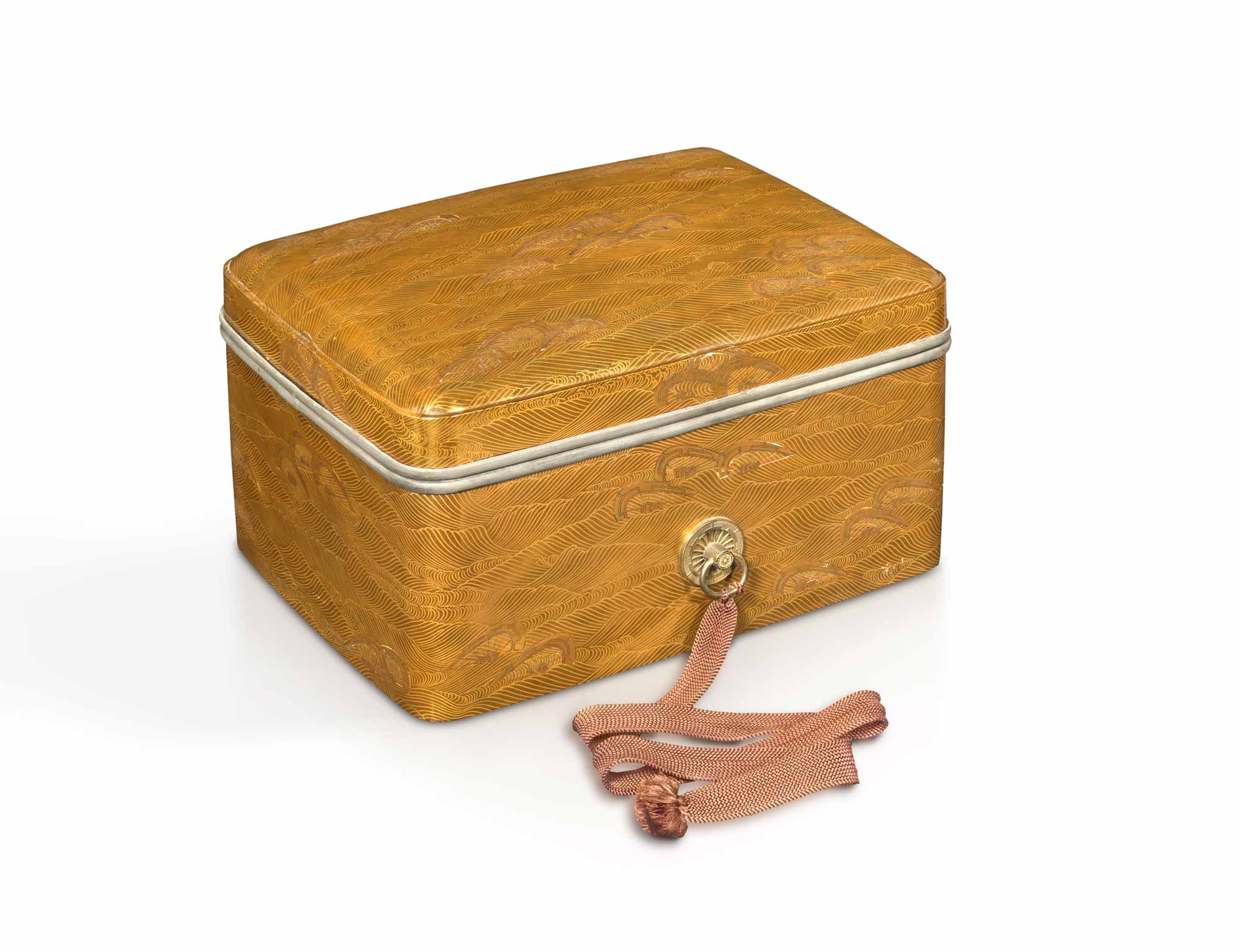 This is a striking stationary box is made using the ikakeji raden technique, in which gold powder is densely sprinkled on a lacquered surface and delicately inlaid with cut-shell. Its cover and body fit snugly together, and their rims are trimmed in tin, and silver fittings in the shape of cart wheels are attached to the sides. The exterior is covered with a design of Katawa-guruma (soaking oxcart wheels in the flowing water) with technique of gold powder makie and mother-of-pearl works.
