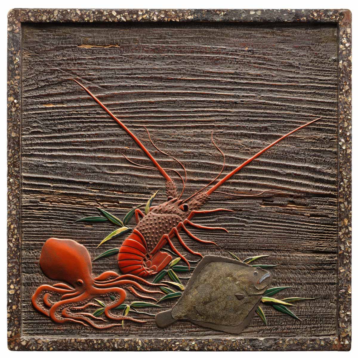 – an ink stick featuring a water-storage jar, a symbol of abundance, framed by stylised karako children playing among aquatic motifs.