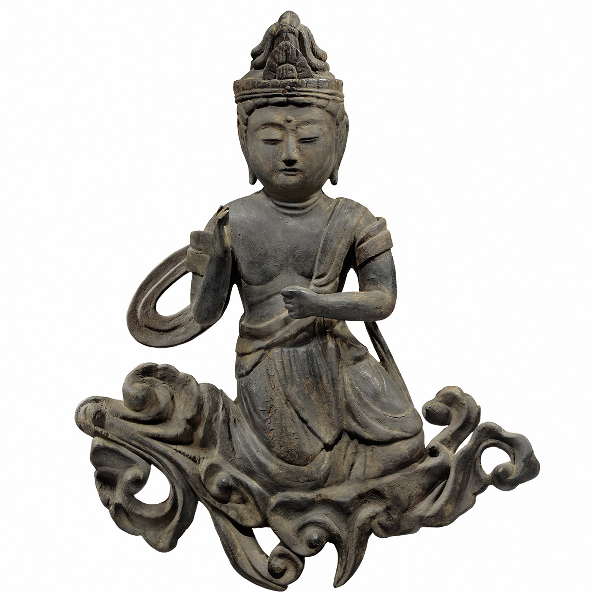 Hiten, literally “Flying Apsaras”, are heavenly beings invisible to the human eye, believed to fly with superhuman power and speed. Japanese Buddhist depictions show Apsaras flying over Buddha's pure land, praising him by scattering flowers, playing instruments or burning incense. Celestial beings such as this were usually placed on the rims of a halo or mandorla behind a Buddha image. The swirling pattern of the cloud indicates that the work was placed on the right side of the mandorla. Considering the work’s size, it may have been part of the mandorla that framed a Buddha about five meters in height. Both hands are probably later additions. Because of the relative proportions of the head and the body, as well as the shape of the clouds, the sculpture appears to have been made in the late Heian Period, around the 12th century. The survival of such celestial beings in private hands is extremely rare.