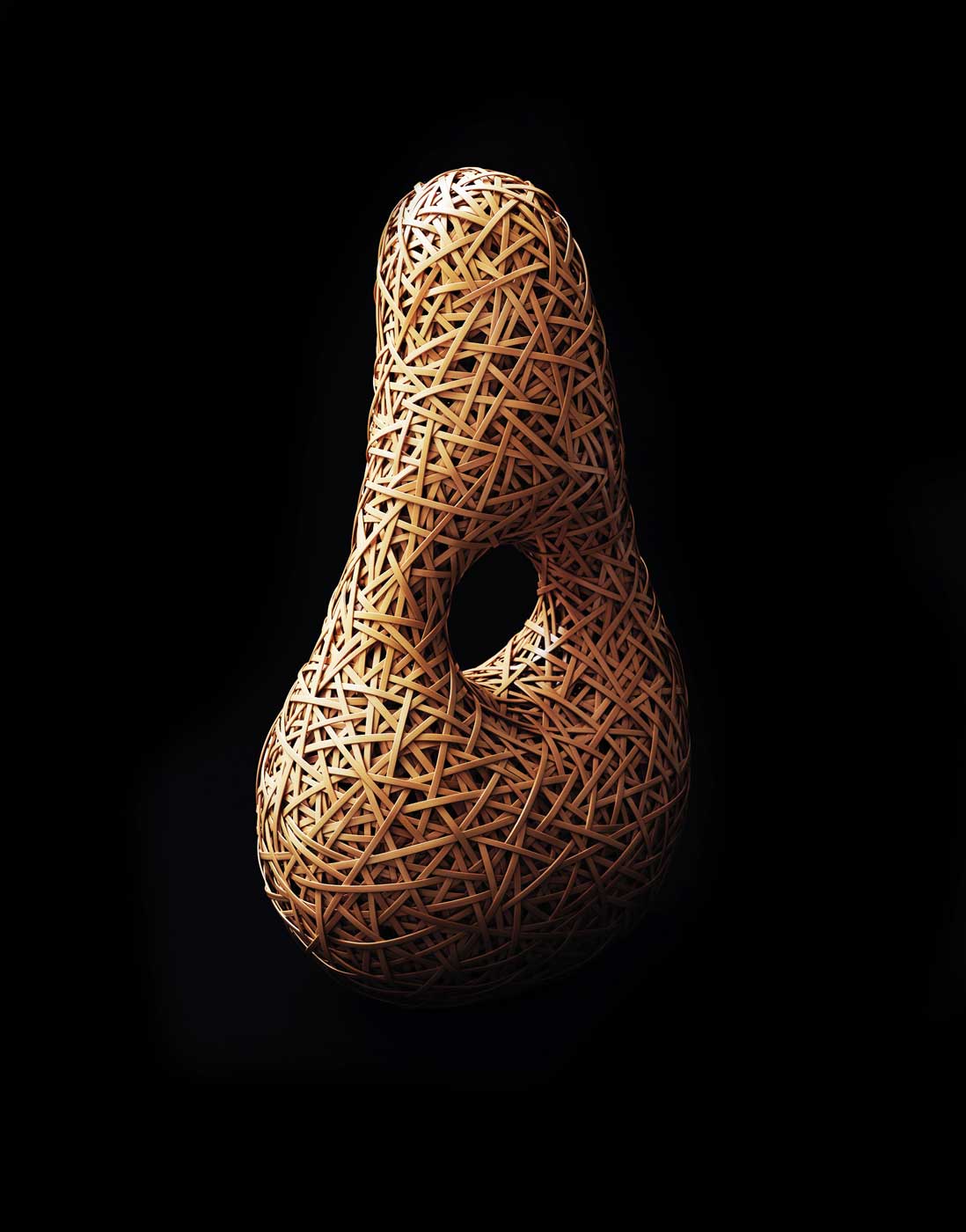 Désormais artiste indépendant, Taniguchi Michito insuffle dans ses œuvres la mémoire des dieux de l’antiquité japonaise et des divinités oubliés par un style de tressage complexe et énergique. L’émotion le gagne également lorsqu’il croise sur une plage des objets abandonnés par la mer. « Coquillages, cailloux, bouteilles et bois flotté aux formes mystérieuses donnent du sens à ma vie. Je m’interroge sur leur histoire. Même si j’ignore tout de leur passé, elles sont précieuses telles quelles. Mon cœur est excité par ce sentiment nostalgique de garder une trace du passé qui me conduit à créer de nouvelles formes».