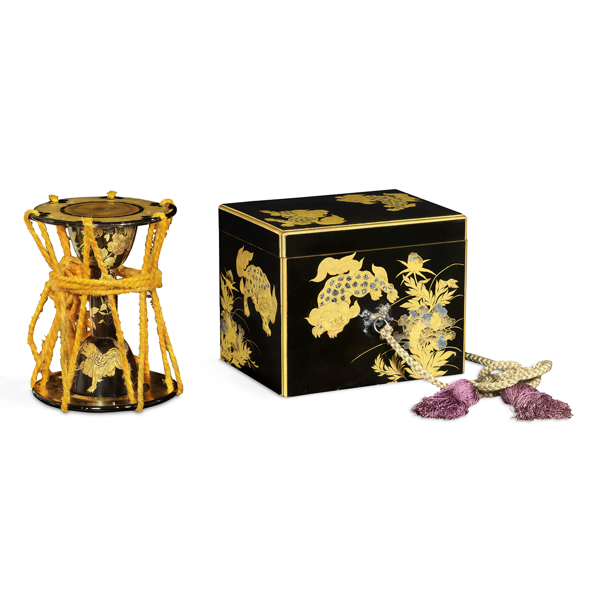 The motif of shishi-botan is lacquered dynamically on the body of drum and the box. Shishi-botan, literally lion and peony, has been a very popular motif in Japan. Shishi was believed as the king of all animals. And also, peony was believed as the king of all flowers. The motif of shishi and peony has been called “shishi-botan’ or ‘karajishi-botan’. They were very often depicted together since ancient time. The original idea came from Buddhism. It was said that only one thing which could kill the strongest animal, shishi, was an insect in his body. And it was believed that the night dew of peony was the only one thing which can kill this insect. This motif was loved as a bold symbol and splendid combination.