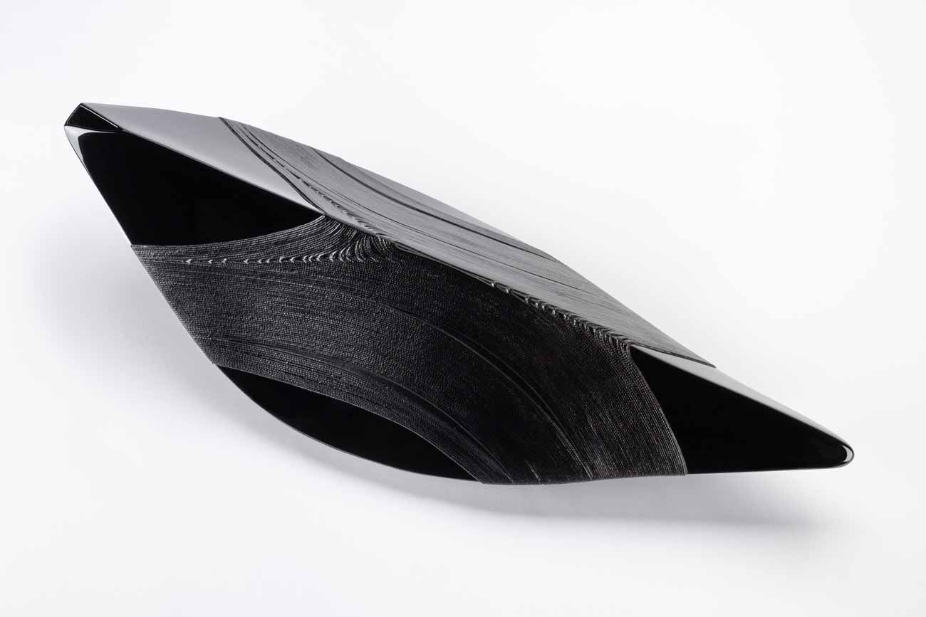Tout droit sorties d'un pays de cocagne, ses sculptures lisses et noires sur noires, jaillissent comme des monts merveilleux.