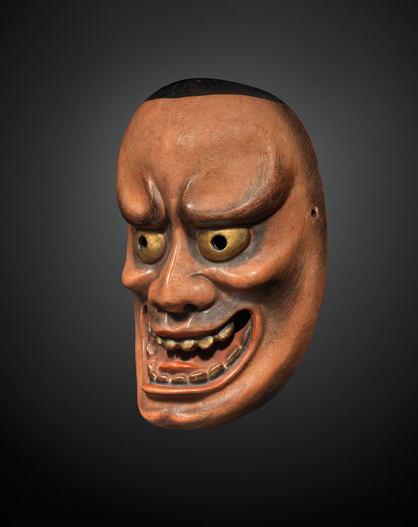 La bouche ainsi ouverte, la grande et large langue rouge du masque et ses dents (supérieures et inférieures) sont visibles.