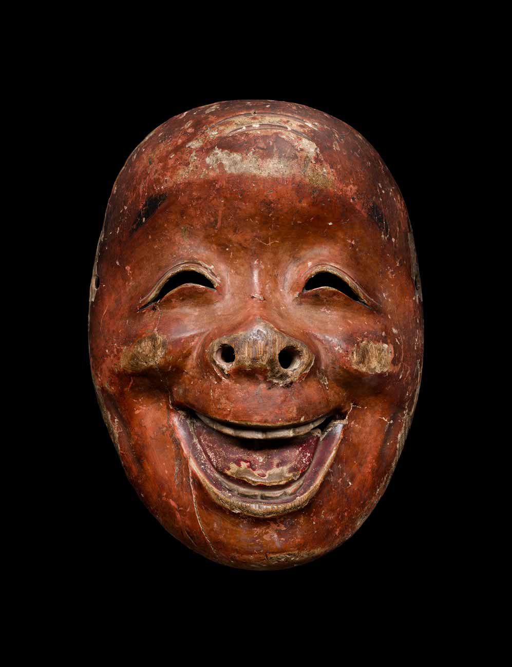 Contrairement aux masques de Kyōgen, destinés à la scène comique du théâtre Nō, les masques de Kagura appartiennent au registre rituel shintō et étaient utilisés dans les danses sacrées offertes aux divinités (kami). La physionomie pleine et souriante, la laque brillante vermillon et les traces d’usage indiquent une fonction cultuelle. À quelques exceptions près (comme Okame et Hyottoko), les masques Kagura n'ont pas de noms génériques. Un sanctuaire ou une troupe donnait à un masque le nom du personnage qu'il incarnait dans la représentation locale. Un même masque pouvait représenter différents personnages, ou le même personnage avec différents noms locaux ; aucun nom propre n'était donc jamais fixé. Ce masque était probablement porté pour un rôle comique ou léger. Ces masques sont connus collectivement sous le nom de dōkemen (道化面)