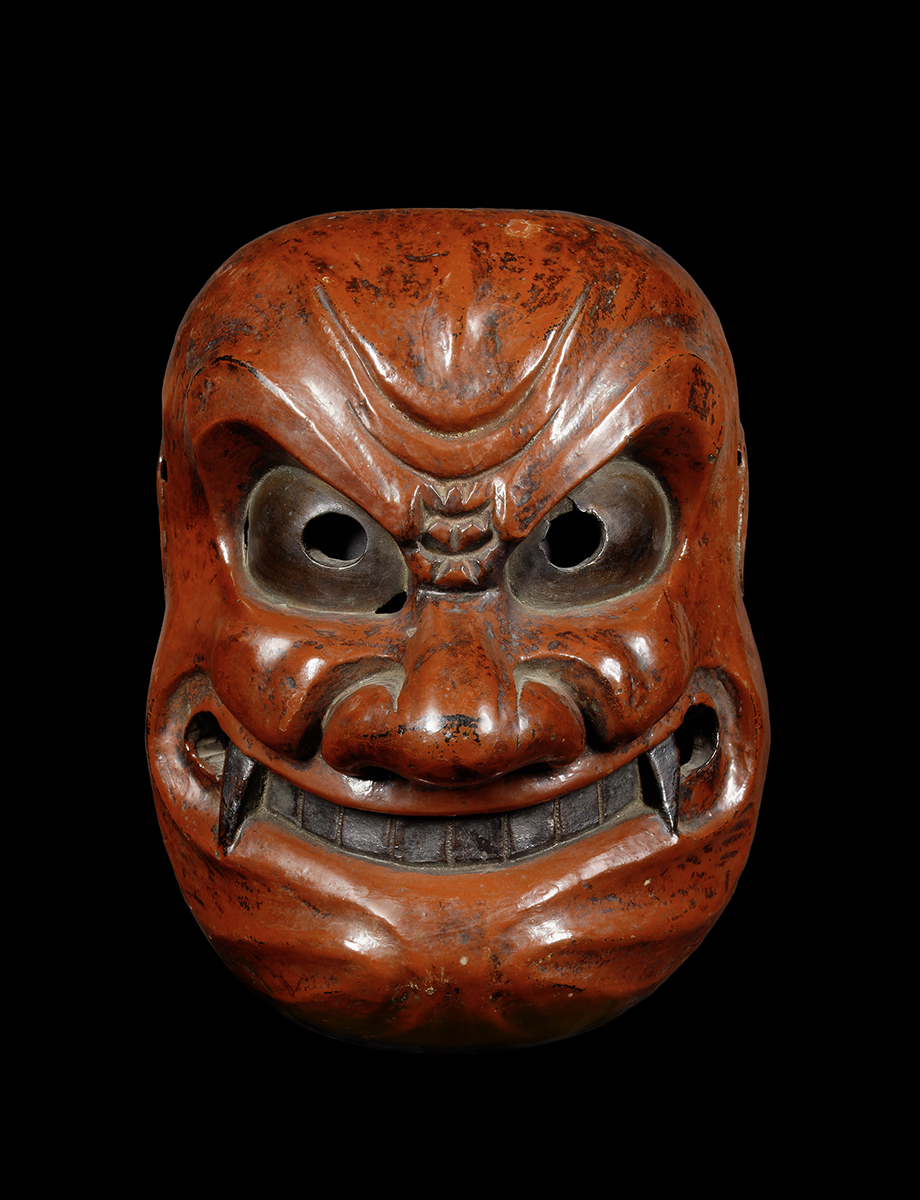 Un masque kagura représentant un démon local non identifié. Kagura (littéralement, « Divertissement Divin ») se réfère à un type spécifique de danse théâtrale shintoïste dont les racines sont antérieures à celles du théâtre nō.