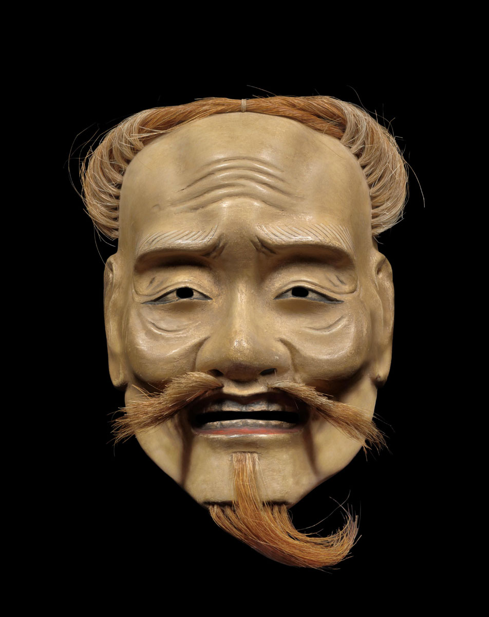 " Bien que le masque appartienne à une catégorie typique de masques nō Waraijo, il s'agit d'un rarissime exemple en cuir. Le matériau et le processus de fabrication suivent le même processus que celui utilisé pour la fabrication des mempo, l’armure faciale des samurai.