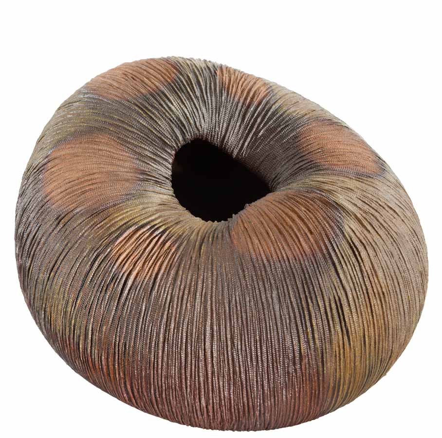 All these works were made in the US between 2014 and 2019, while Momoko was living in Ithaca, NY. The works are all tebineri (coil-built) forms, not wheel thrown. Once complete, yet while the clay is still soft, Momoko textures the surfaces. The ones with vertically scratched lines were treated with bamboo and metal tools, while the teapots and the work called Fissure, were stippled with a stiff brush. They were then fired for 3-5 days in an anagama (wood-fired kiln). None of the works were glazed. All the surface coloring is the result of the natural wood ash that builds up in the kiln.