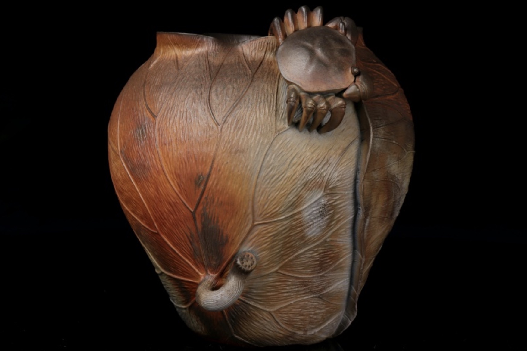 Lotus and Crab bizen vase by Konishi Toko II (Mitsue) (1927-2018)