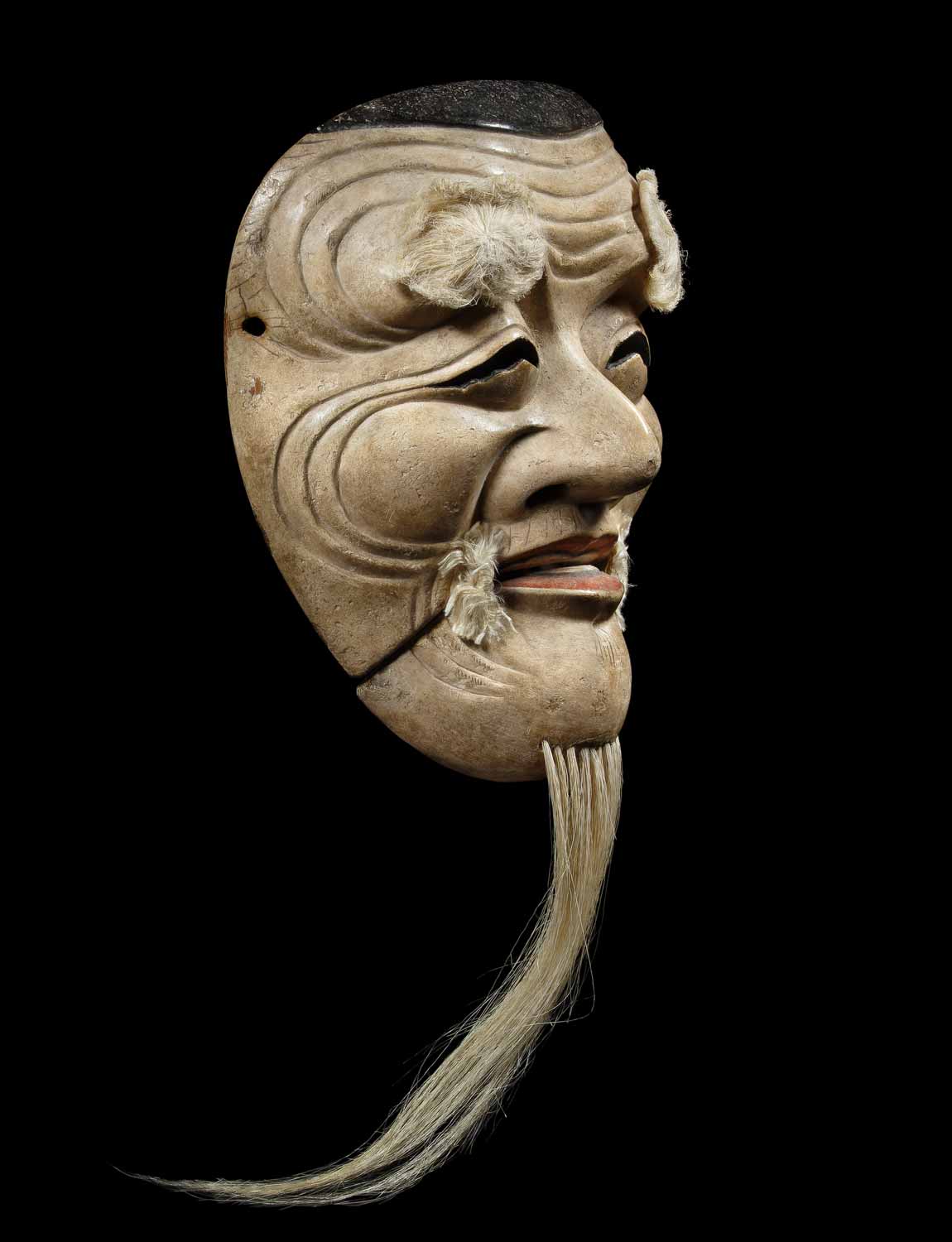 Okina, also known as Hakushikijō, this white-faced mask of a happy old man is used in noh theater and festival performances of the play OKINA, also known as SHIKISANBA.