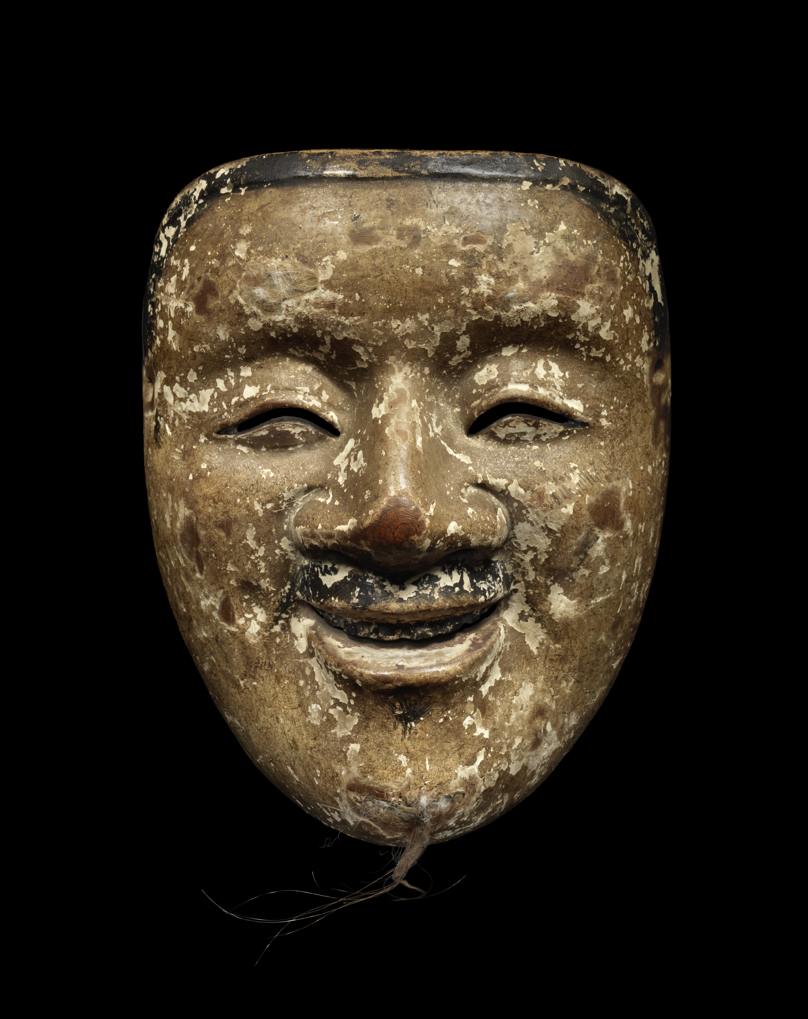 Enmei-Kajya has an almost chubby face and a smiling expression, half closed eyes and full lips arched to show the upper row of teeth. The man is full of energy and his facial outlines as well as the presence of a thin black moustache, reflect this privileged condition. Enmei-Kajya is the "adult man who prolongs life", who is evoked in order to bring longevity. Originally Enmei-Kajya’s mask was part of the Sarugaku repertoire, and it belonged to the group of the Okina "old men". But it already differentiated itself, for it was the only one that did not portray an old woman; also, it had no moving lower jaw like the others. It appeared in the Okina ritual dance in the scene Junitsuki Orai in the company of Chichinojo (the latter having the role of Enmei-Kajya ‘s father), and it was sometimes used in the Noh drama called Sagi. Then it came into the repertoire of popular Kagura masks and of Kyōgen masks. The oldest masks of Enmei-Kajya known date from the Kamakura period (Chusonji temple in Iwate prefecture and Nagataki Hakusan Jinja shrine in Gifu prefecture), which is well before the Noh theater appeared. For this reason, stylistically they still reflect Heian aesthetics, and certain affinities with some Bugaku masks. Probably it was Enmei-Kajya's mask that was used as a prototype for some types of Noh masks.