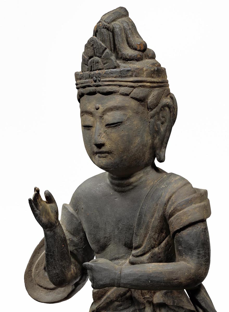 Hiten, literally “Flying Apsaras”, are heavenly beings invisible to the human eye, believed to fly with superhuman power and speed. Japanese Buddhist depictions show Apsaras flying over Buddha's pure land, praising him by scattering flowers, playing instruments or burning incense. Celestial beings such as this were usually placed on the rims of a halo or mandorla behind a Buddha image. The swirling pattern of the cloud indicates that the work was placed on the right side of the mandorla. Considering the work’s size, it may have been part of the mandorla that framed a Buddha about five meters in height. Both hands are probably later additions. Because of the relative proportions of the head and the body, as well as the shape of the clouds, the sculpture appears to have been made in the late Heian Period, around the 12th century. The survival of such celestial beings in private hands is extremely rare.